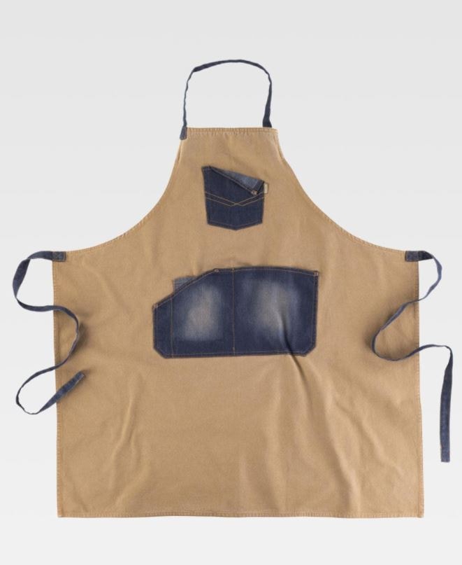 Avental com peitilho em tecido de canvas combinado com ganga.