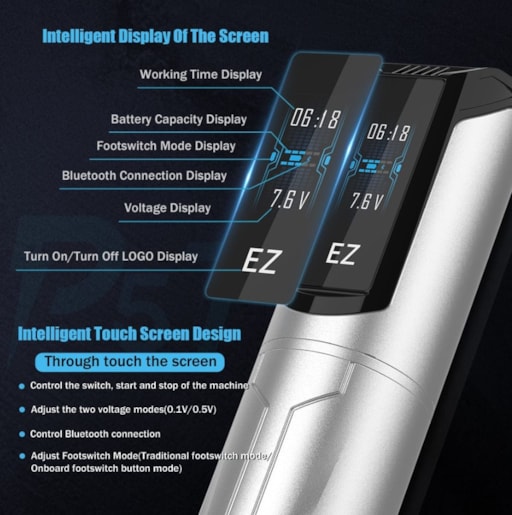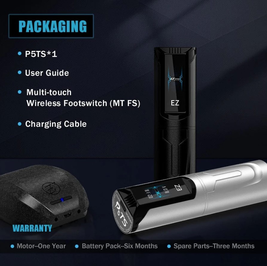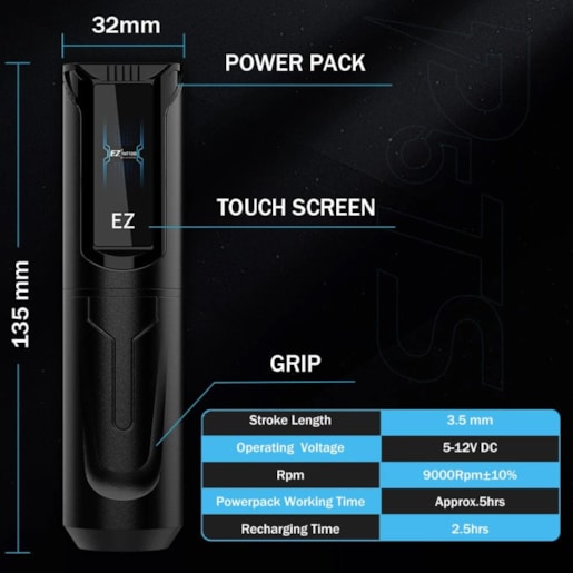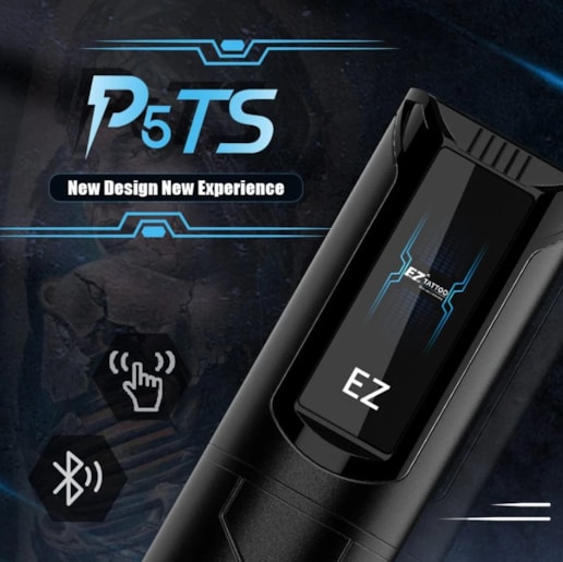 Keep breaking new ground. EZ P5 TS is the first digital touch screen wireless pen machine with tattoo industry development. Equipped with the D click system, the P5 TS always maintains the cartridge needle positions and accuracy remains consistent at all times. Powered by smart chip with direct drive system, it is suitable for precise line work, black and gray shading, solid color packaging and compatible with most tattoo cartridges in the tattoo industry.