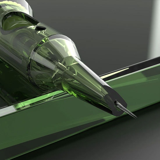These newly designed tips allow for minimal ink splatter, the translucent one-piece green cartridge body gives artists maximum visibility to the tattoos they are working on, the extra-stable end cap design and precise positioning system make artists relax more without having to worry about the needle wobbling. Plus, the needles stay sharp, allowing you to work for long hours without the uncertainty of whether the next cartridge might be an improvement.