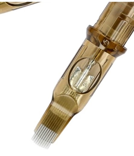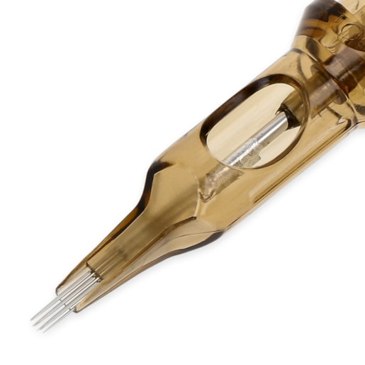 A top quality Kwadron SEM Soft Edge Magnum cartridge with a diameter of 0.30 mm (#10). The curvature of the needles in this cartridge creates what is known as a haze when shading, i.e. a more intense colour in the centre and a shadow cast on the outside. Ideal for creating tonal, smooth transitions, fading effects and the like. Great for filling in black or colour, softer shading (less traumatic to the skin), as in portraits, realism or blurred backgrounds.