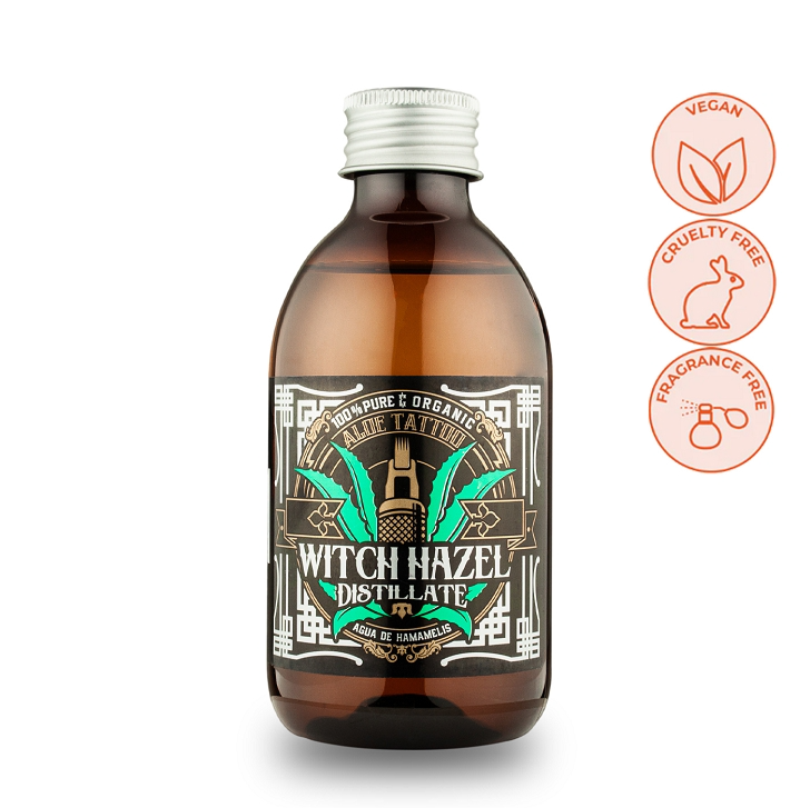Made from the distillation of the leaves of the Hamamelis Virginiana plant, its properties help soothe irritated skin and prevent bleeding to promote healing. It can be used to dilute tattoo inks or as a cleanser, removing germs and bacteria so that the skin is completely prepared to be worked on.