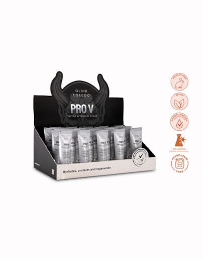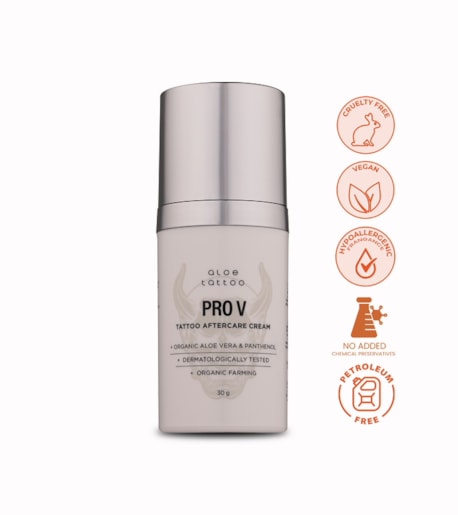 Apresentamos o nosso novo creme pós-tatuagem ALOE PRO V, acabado de sair do nosso laboratório. Completamente isento de conservantes e derivados de petróleo.