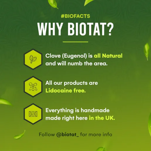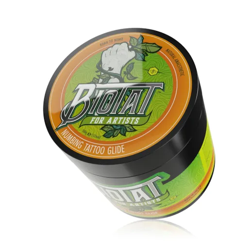 Por que Biotat® Glide? Deslizamento transparente para maior precisão. Anestesia natural sem lidocaína. Os clientes ficam mais confortáveis. Ótimo para sessões longas. Reduz a vermelhidão. Não entope as agulhas. Reduz a necessidade de limpeza. Fórmula vegana. Anti-inflamatório. Antibacteriano. Antimicrobiano. Antifúngico. Rótulos sem árvores. Embalagem ecológica. Fabricado no Reino Unido.