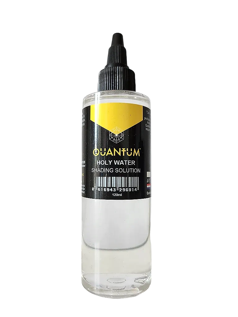 Nossa solução de sombreamento de água benta agora está em conformidade com REACH! Esta solução de mistura transparente é um aditivo para todos os fins formulado para misturar tinta de tatuagem preta para sombreamento. Ele permite que você dilua as tintas pretas Quantum Tattoo para criar a lavagem cinza perfeita.